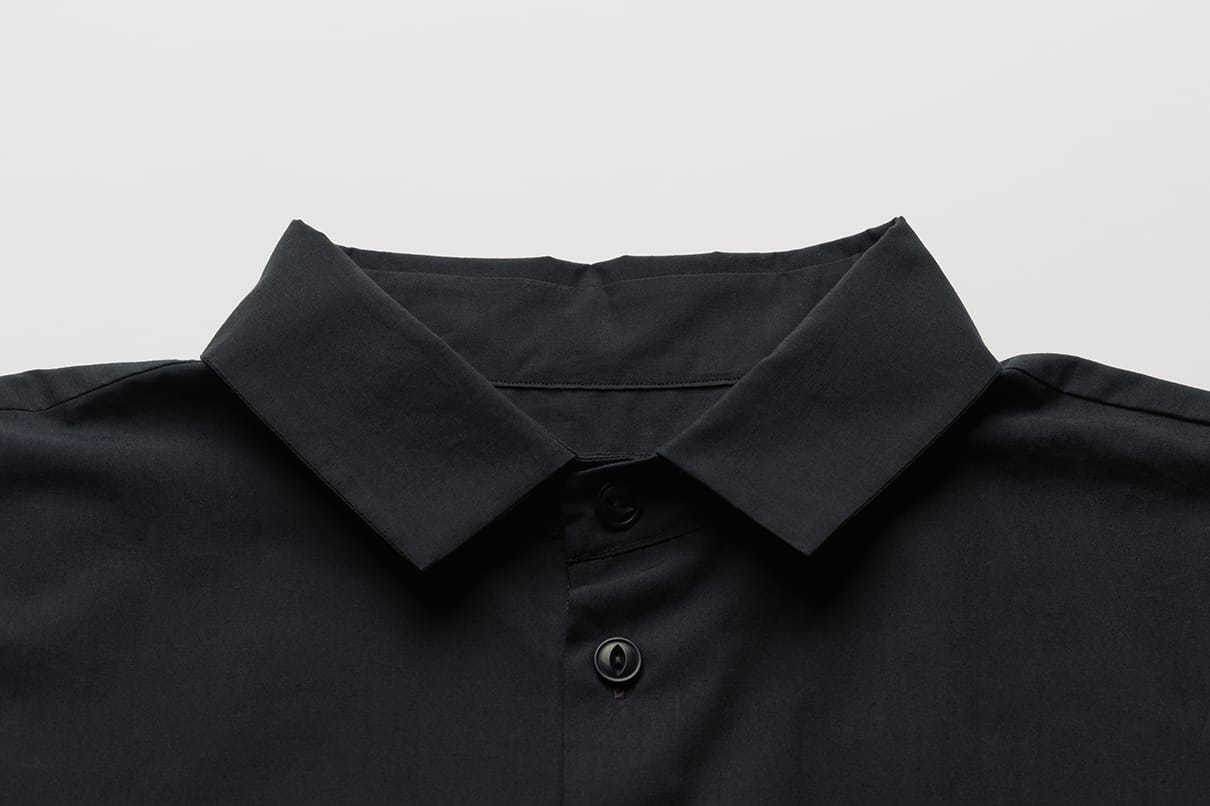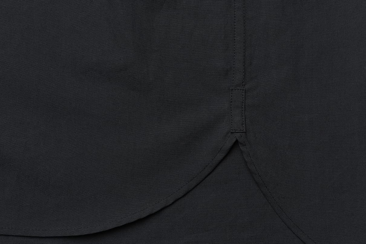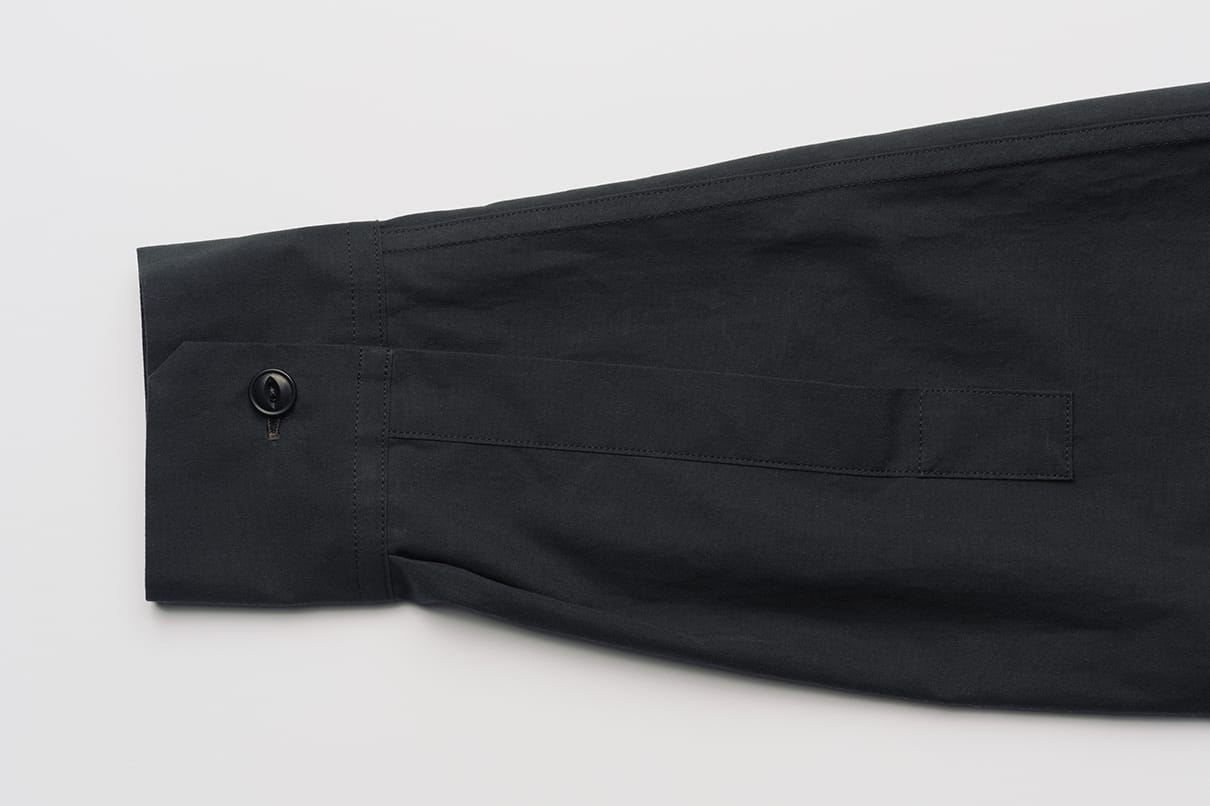 衿は比較的細幅で、カジュアルなテイストを加え、シングルのノッチドカフスがシンプルながら洗練された印象を与えます。