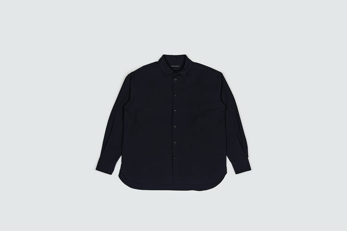 このシャツは、高級綿の代名詞である超長綿バルバデンセ種の50/1コットンのブロード生地を使用しており、オイリー感と滑らかなタッチ、そして深い陰影のある光沢が上質な雰囲気を引き立てます。